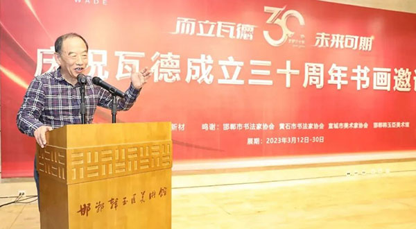瓦德集團董事長謝富強向與會的各路藝術(shù)家及賓朋表達了熱情歡迎。向河北邯鄲、湖北黃石、安徽宣城三地文聯(lián)、書協(xié)、美協(xié)和書畫家們的大力支持表達了衷心感謝。尤其對中國知名書畫家,邯鄲市書協(xié)主席,文化名人,著名企業(yè)家韓玉臣先生對瓦德集團慶典活動的鼎力支持表達了深深的敬意和由衷地感謝。在三千年歷史的趙國都城邯鄲,能有瓦德集團如此注重文化藝術(shù)的實屬難得,能將深厚的中國文化的脈絡注入到自己的企業(yè)產(chǎn)品中非常難得。