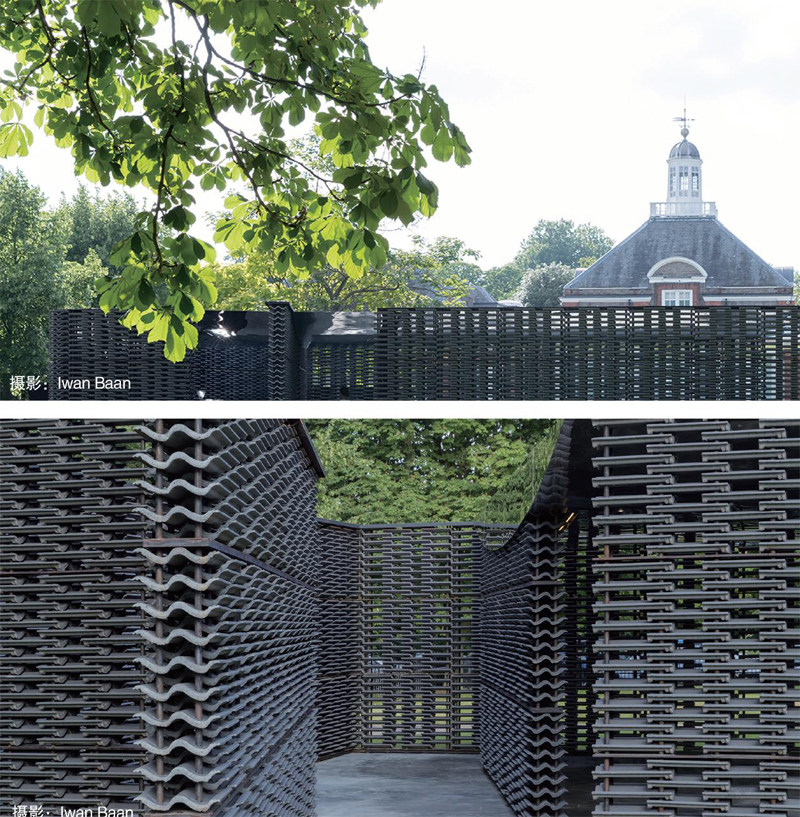 我們都知道,水泥瓦一般用作普通民房或者高檔別墅的屋頂建設,但是設計師弗里達、埃斯科韋多設計的蛇形展亭,以水泥瓦建造,這種水泥瓦一般用于建造屋頂,顏色偏深而且具有獨特的質感。展亭將水泥瓦以左右錯位、類似植物的排列方式堆疊,形成帶有墨西哥特色的鏤空墻幕。展亭的庭院中還設一個三角形的水池,屋頂?shù)紫聞t以鏡面鋪就,在日光照射下將呈現(xiàn)不同的視覺效果。展亭的中軸線從南延伸至北,與數(shù)英里以外的格林威治子午線的方向契合,以此強調(diào)展亭同時也是“時間儀”的這一特質。